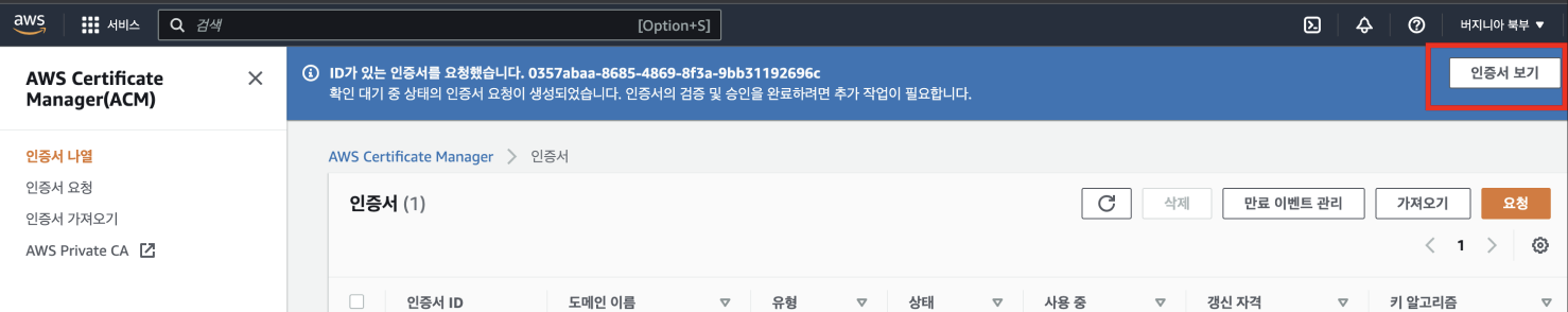 여기서 만약 자신이 생성한 인증서가 보이지 않는다면, 인증서를 발급받은 리전이 [버지니아 북부] 가 아닐 확률이 높습니다.