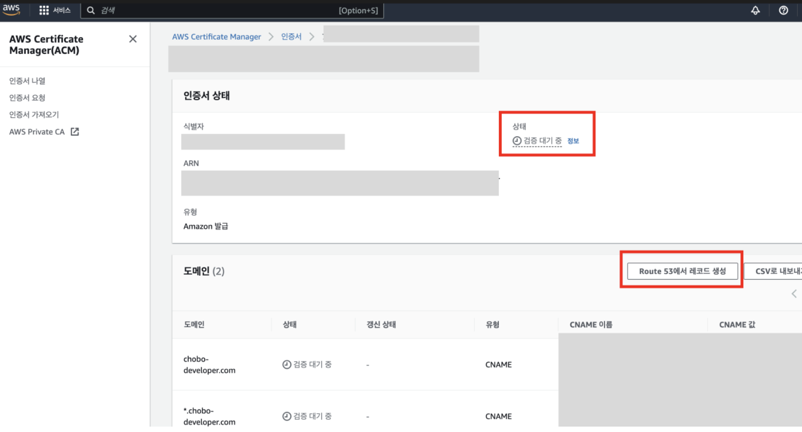 4. 구입한 도메인에 대한 인증서 발급(AWS Certifiacate Manager)