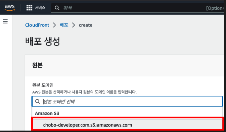 원본 도메인을 선택해야하는데 입력 창을 클릭하면 처음에 만들었던 s3 버킷을 선택할 수 있게 목록이 나옵니다.