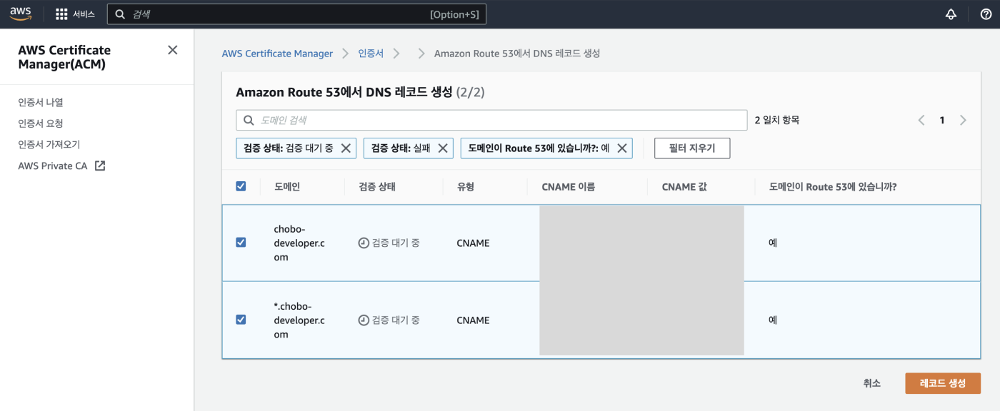 - 구입한 도메인에 대한 인증서 발급 (AWS Certificate Manager)