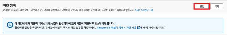 S3 [권한] 탭으로 이동하여 아래에 내려보면 [버킷 정책] 란이 있습니다.