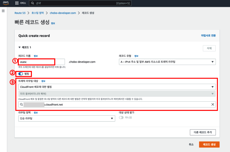 1. [레코드 이름] 란에는 CloudFront 생성 시 설정한 [대체 도메인 이름] 과 같게 해주어야 합니다.