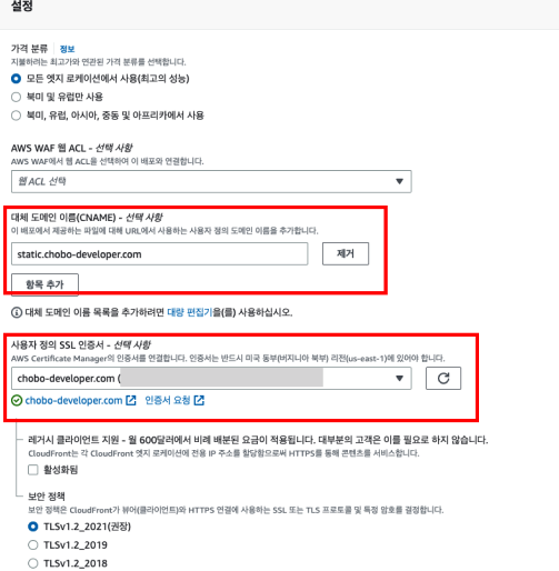 중요! [대체 도메인 이름]에는 CloudFront에 연결될 수 있는 도메인 명을 입력해야합니다.
