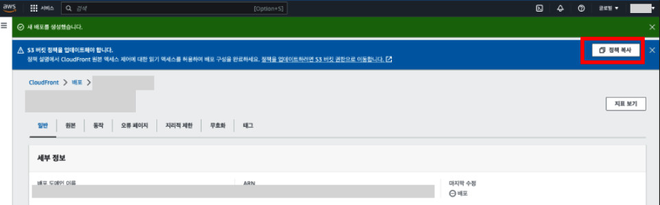 CloudFront 설정을 완료하고 [배포 생성] 버튼을 누르면 위와 같이 파란색 창이 나오고 [정책 복사]란 버튼이 나옵니다.