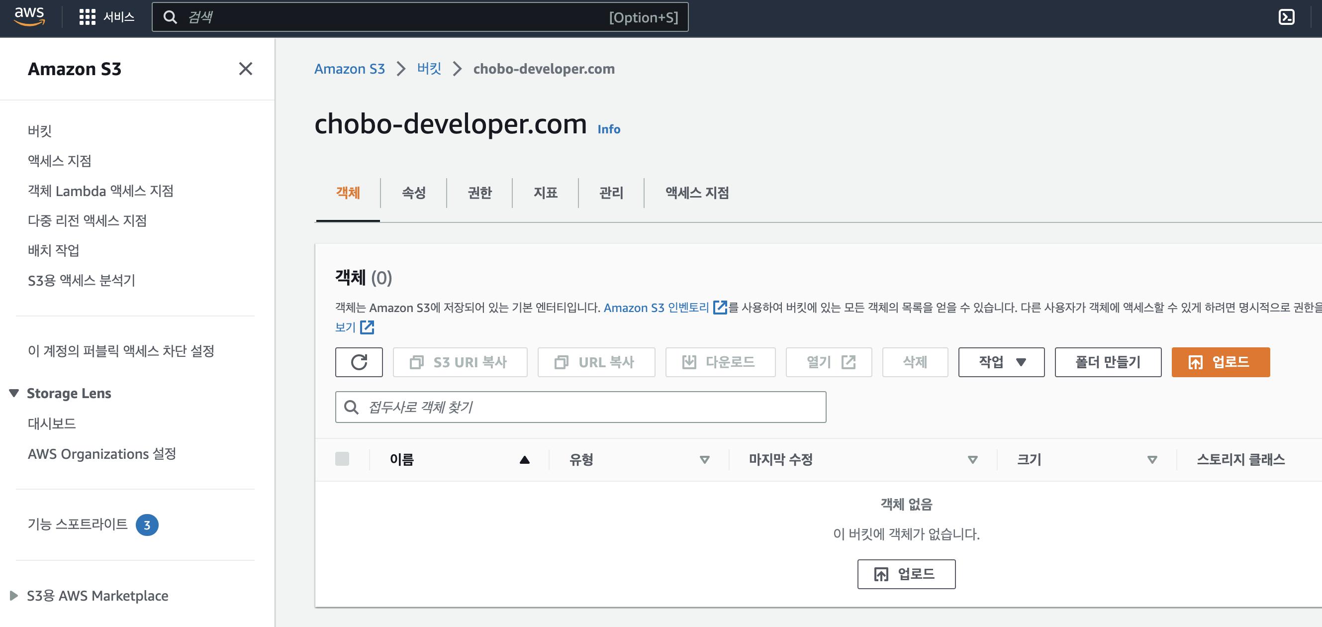 위 그림과 같이 버킷 생성을 완료하였습니다.