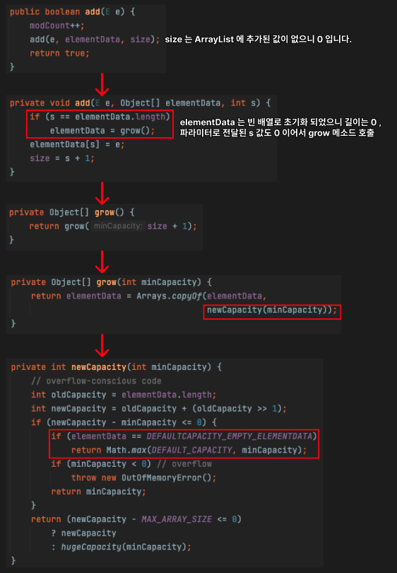 값을 저장하는 배열이 DEFAULTCAPACITY_EMPTY_ELEMENTDATA 일 때만(기본 생성자로 생성했을 떄) 빨간 박스의 if 문을 타서 10으로 초기화됩니다. 즉, EMPTY_ELEMENTDATA 는 초기화 값을 0으로 명시적으로 주었지만 Lazy allocation 을 위해 static 변수의 값을 임시로 할당하고 값을 처음으로 더하면 10으로 되는 게 아닌 1 로 초기화 될 것입니다.